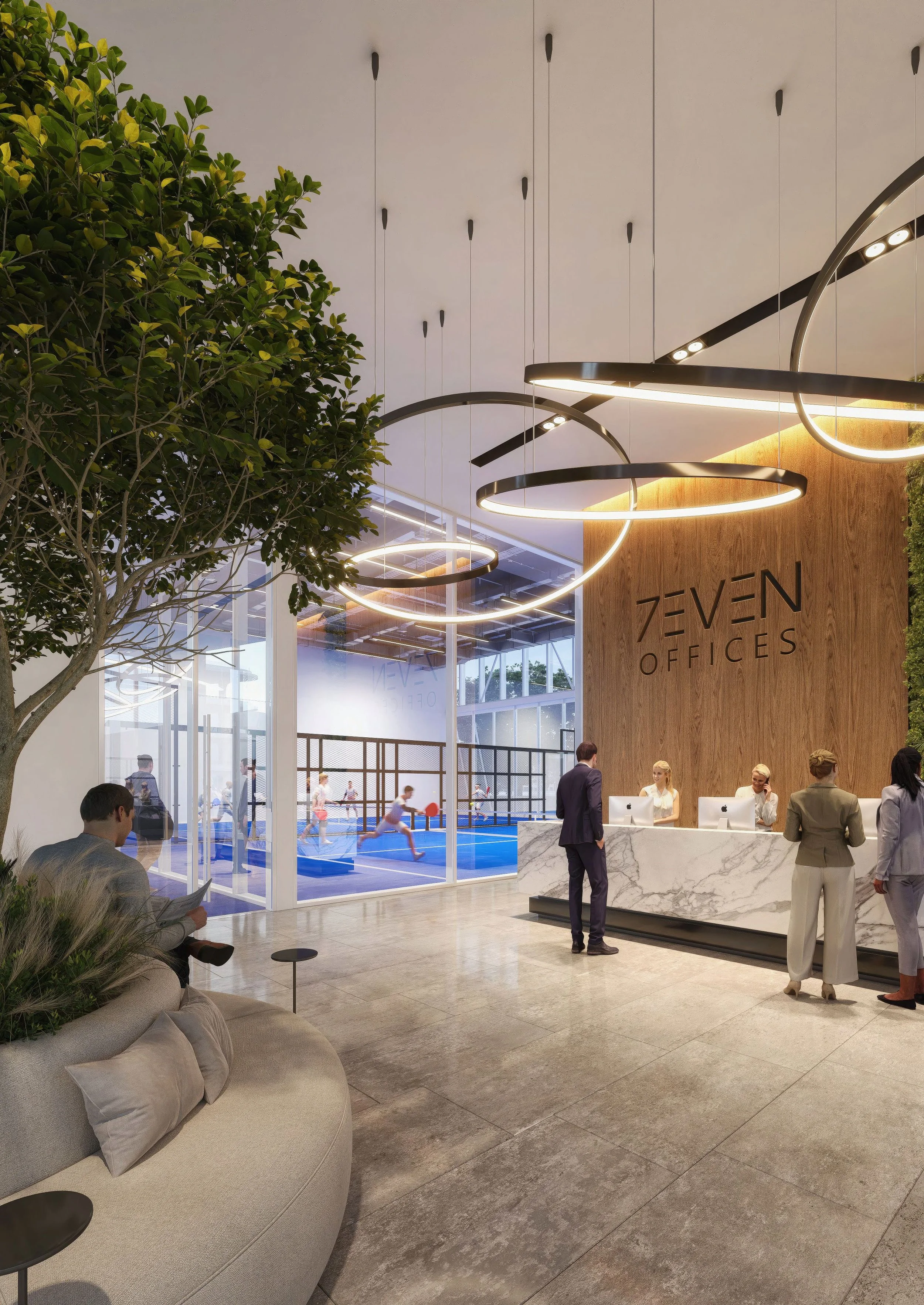 Its parametric double-skin façade blends beauty and performance — acting as a solar filter and symbol of bioclimatic innovation. Inside, 7EVEN OFFICES offers premium offices, flexible coworking areas, a modular conference center, panoramic dining, and padel courts, all supported by smart energy systems and eco-efficient technologies.